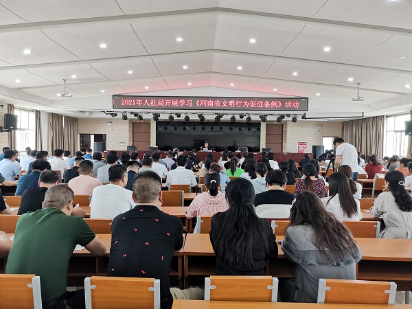 为深入贯彻学习《河南省文明行为促进条例》,进一步引导干部职工树立文明观念,促进文明行为养成,发挥模范引领作用,2021年5月13日下午,人社局组织全体干部职工在会议室集中学习了《河南省文明行为促进条例》。